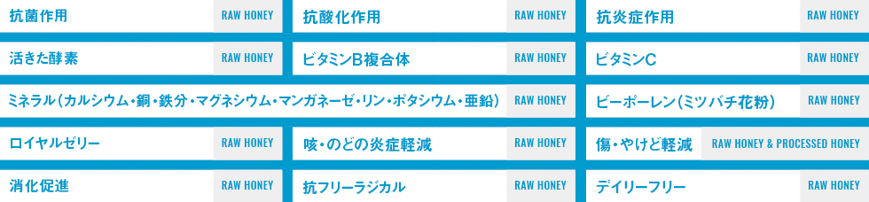 生蜂蜜に含まれるビーポーレンには生命に必要なビタミンやミネラルが豊富に含まれています。 ビタミンは元気にしてくれるビタミン複合体や免疫力を高めるビタミンCなどミネラルはカルシウム、ナトリウム、マグネシウム、ポタシウム、鉄など 抗菌、抗酸化物質がフリーラジカルと戦うサポートをします。 脳の働きに大きく作用するフラボノイド、ピノセンブリンも含まれています。 活きた酵素が食べた物の消化、分解を助けます。